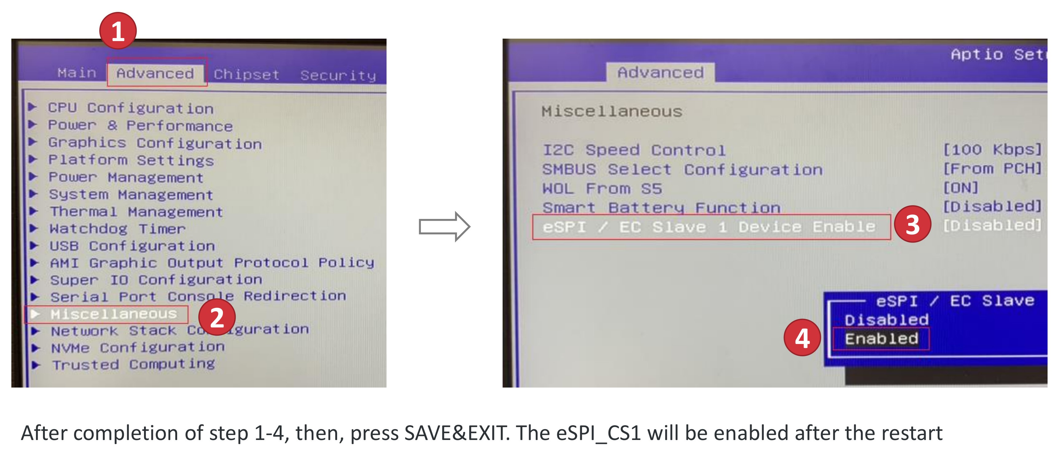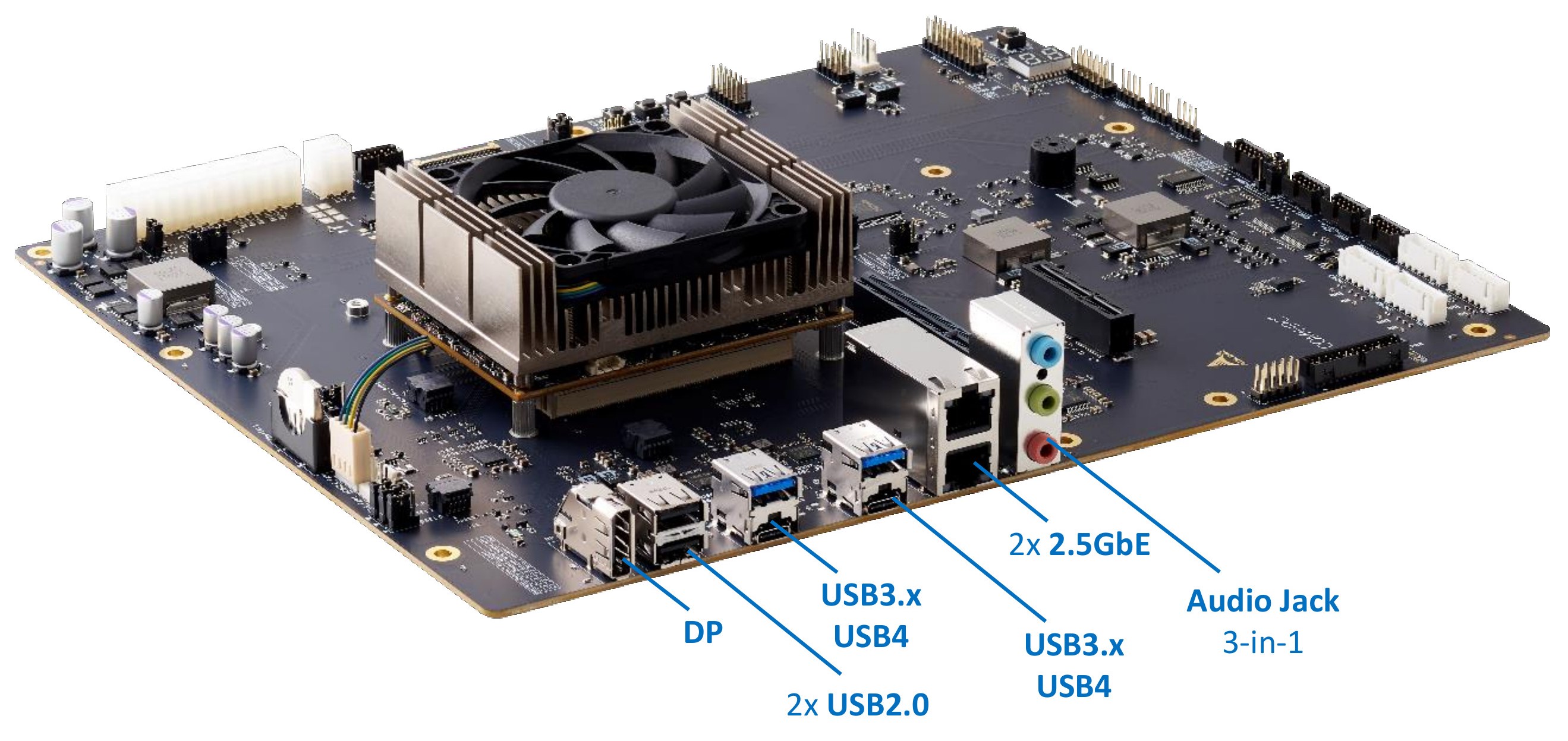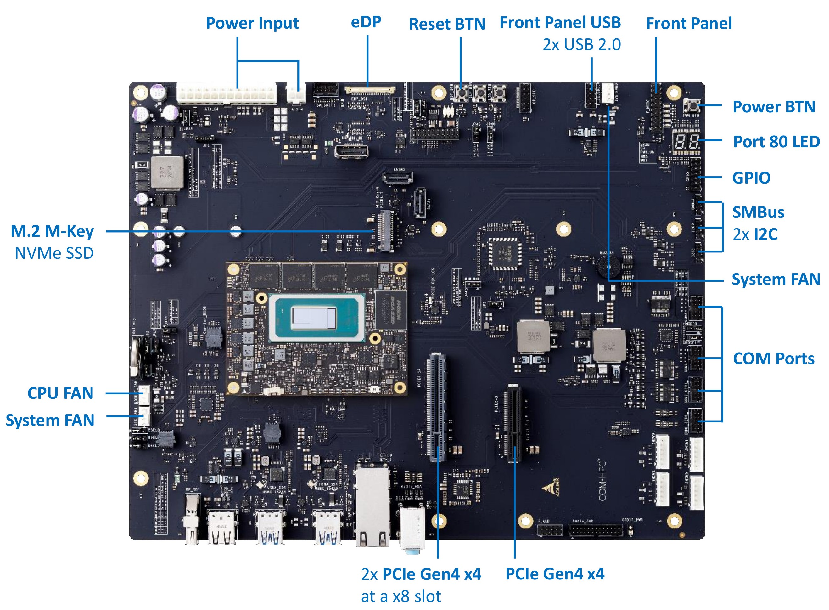 Interfaces PCIe Gen4 x4One x4 lanes at a x4 slot (slot named as PCIE0-3) Two x4 lanes at a x8 slot (slot named as PCIE8-15) An additional PCIe adapter card will be required for fully utilize these two x4 lanes M.2 M-KEYOne PCIe Gen4 x4 lanes at M.2 M-KEY connector for NVMe SSD, up to 22110 USB4 at Type C ConnectorTwo USB4 interface at Type C connectors. The feature of each USB4 interface as below USB3.x 10Gbps data transfer speed DisplayPort Alt Mode 5V/2A power delivery eDP (Embedded DisplayPort)40-pin connector Pin Signal Pin Signal 1 N.C 2 BKL_PWR 3 BKL_PWR 4 BKL_PWR 5 BKL_PWR 6 N.C 7 N.C 8 BKL_CTRL 9 BKL_ENABLE 10 GND 11 GND 12 GND 13 GND 14 HPD 15 GND 16 GND 17 GND 18 GND 19 N.C 20 Panel_PWR 21 Panel_PWR 22 Panel_PWR 23 Panel_PWR 24 GND 25 AUX_N 26 AUX_P 27 GND 28 eDP_LANE0_P 29 eDP_LANE0_N 30 GND 31 eDP_LANE1_P 32 eDP_LANE1_N 33 GND 34 eDP_LANE2_P 35 eDP_LANE2_N 36 GND 37 eDP_LANE3_P 38 eDP_LANE3_N 39 GND 40 N.C BKL_PWR (backlight power) default is 5V, Panel_PWR (panel power) default is 3.3V. Both of them can be adjusted by JP28, JP29, as table below JP28 for panel power setting Jumper Status 1-2 3.3V (default) 2-3 5V JP29 for backlight power setting Jumper Status 1-2 12V 2-3 5V (default) COM PortCOM1_SER0 and COM2_SER1 are two individual headers. 2.0mm pitch Both of them are sourced from COM-HPC module. Pin Signal Pin Signal 1 N.C 2 N.C 3 UART_RX 4 UART_RTS 5 UART_TX 6 UART_CTS 7 N.C 8 N.C 9 GND 10 N.C COM3 and COM4 are two individual headers. 2.0mm pitch Both of them are sourced from a Super I/O (eSPI_CS1 enabled required) Pin Signal Pin Signal 1 DCD 2 DSR 3 RX 4 RTS 5 TX 6 CTS 7 DTR 8 RI 9 GND 10 N.C Jumpers for COM3 (named as MODE0/MODE1) for RS232/RS485/RS422 selection Mode MODE0 MODE1 RS232 (default) 2-3 1-2 RS485 1-2 2-3 RS422 1-2 1-2 COM3 and COM4 are from Super I/O. Super I/O communicates with CPU through eSPI bus and Super I/O locate at carrier board. eSPI_CS1 need be enabled for the usage and it can be set-up at BIOS menu. eSPI_CS1 default is disabled Front Panel SignalPower Button, Reset Button, HDD LED, Power LED signals Pin Signal Pin Signal 19 N.C 20 N.C 17 N.C 18 BUZZER 15 N.C 16 N.C 13 GND 14 N.C 11 +5VSB 12 +5V 9 N.C 10 N.C 7 SYS_RESET# 8 GND 5 GND 6 PWR_BTN# 3 HDD_LED_N 4 GND 1 HDD_LED_P 2 +5V Front Panel USB9-pin header at 2.54mm pitch Pin Signal Pin Signal 1 +5V 2 +5V 3 USB7_N 4 USB6_N 5 USB7_P 6 USB6_P 7 GND 8 GND 9 GND SMBus4-pin header at 2.54mm pitch Pin Signal Pin Signal 1 +1.8V 2 SMB_DATA 3 SMB_CLK 4 GND I2CTwo I2C buses Individual 4-pin header at 2.54mm pitch Pin Signal Pin Signal 1 +1.8V 2 I2C_DATA 3 I2C_CLK 4 GND GPIO14-pin header at 2.54mm pitch Pin Signal Pin Signal 1 1.8V 2 GPIO_06 3 GPIO_00 4 GPIO_07 5 GPIO_01 6 GPIO_08 7 GPIO_02 8 GPIO_09 9 GPIO_03 10 GPIO_10 11 GPIO_04 12 GPIO_11 13 GPIO_05 14 GND CPU FAN4-pin connector. The FAN control signals sourced from COM-HPC module Pin Signal 1 GND 2 +12V_5V_FAN 3 SENSE_FAN 4 PWMOUT_FAN System FANTwo system FAN connectors. All are 4-pin. The FAN control signals sourced from Super I/O (need enable ESPI_CS1 at BIOS) Pin Signal 1 GND 2 +12V_5V_FAN 3 SENSE_FAN 4 PWMOUT_FAN Power Input24-pin and 4-pin power connector. All of them must be connected CPU (COM-HPC module) is powered by the 12V from 24-pin and 4-pin Once the mechanical switch of power supply switch-on, the system will power on directly