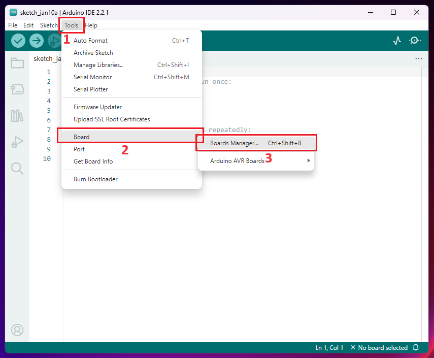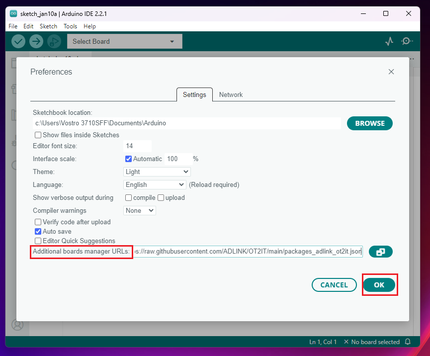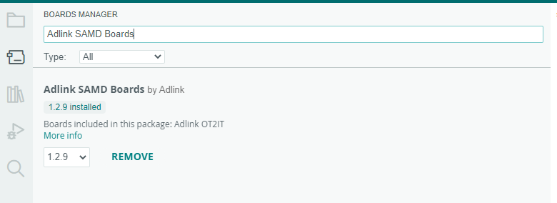 Arduino IDE Environment Setup1. Download and InstallationDownload and install the latest version of Arduino IDE from https://www.arduino.cc/en/software Note: First-time users set up the Arduino IDE as shown below and install all supported device software. 2. Setting Preferences1. Upon the successful installation, open Arduino IDE and go to [File] —> [Preference] 2. Add URL https://raw.githubusercontent.com/ADLINK/OT2IT/main/package_adlink_ot2it.json in ‘Additional boards manager URLs’ and click ‘OK’ 3. Go to [tools] —> [Board] —> [Boards Manager] to download the configurations and related libraries 3. Board Support Packages1. Install ADLINK SAMD Boards support in the Boards Manager, as shown in the screen below 2. Once successfully installed, you will see the boards list on [tools] —> [Board] —> [Boards Manager], select “Adlink OT2IT” 3. Verify the Board name on [tools] —> [Board]