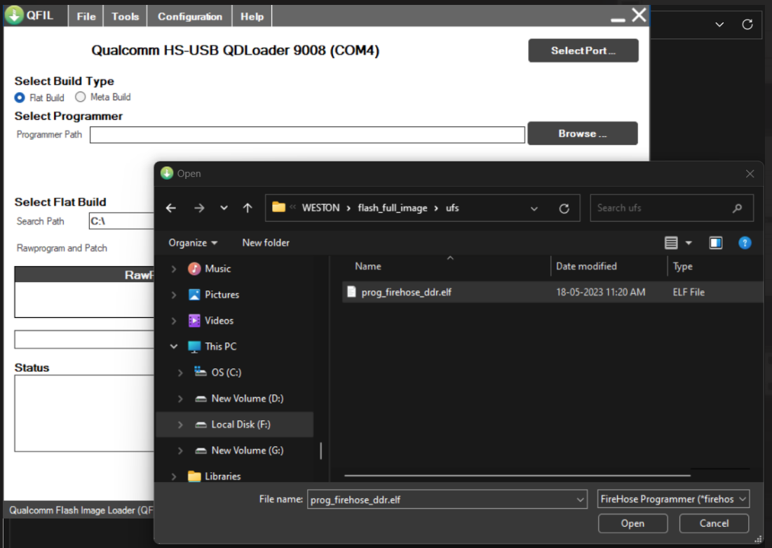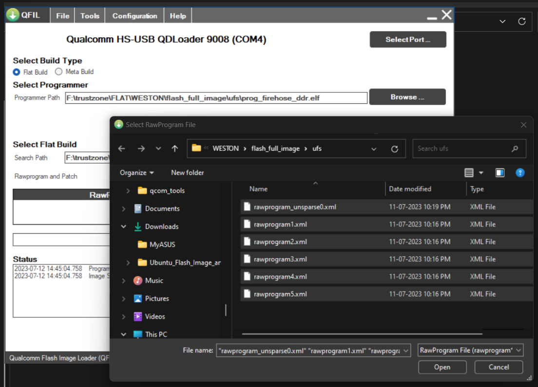 Flashing Guide for Ubuntu OS on I-Pi SMARC RB5N The Ubuntu OS is only for evaluation purposes(Internal use). If it is for commercial use, you need to get a license from Canonical. Canonical’s IP policy can be found here: https://ubuntu.com/embedding/faqs. This document provides detailed information on flashing Ubuntu OS on the I-Pi SMARC RB5N. Prerequisites To flash the OS on the I-Pi SMARC RB5N, you need a Windows PC (Windows 10/Windows 11). Download the prebuilt Ubuntu image files by clicking here. Download and Install ADB and Fastboot drivers1. Please download the ADB and Fastboot drivers and install them using the link provided below. Android USB Driver ADB Fastboot Tool Note: If you encounter the “0 Files Copied Error,” download and install the “15_Second_ADB_Installer_v1.3.0” version, as the latest version might not be compatible with your computer’s Windows version. Download QPST Tool and QUALCOMM USB Driver to Flash the Image1. Please download the driver below, USB driver 2. When installing the USB driver, please select the setup type as ETHERNET-DHCP. QPST TOOL 3. Please select Complete during installation as mentioned below. 4. After installing QPST, the Qualcomm Flash Image Loader (QFIL) Tool will be installed on your PC. Please open the QFIL Tool (Search bar -> Application -> QFIL). How to Flash the ImageTo initiate the flashing process for the Ubuntu image, it is essential to first transition the module into Emergency Download (EDL) mode. Once the module is in EDL mode, the Ubuntu image can be flashed using either Qualcomm Flash Image Loader (QFIL) or Android Debug Bridge (ADB). Enter into EDL(Emergency Download) Mode 1. Micro USB. 2. Power jack. 3. UART Pins (See How to Read Console Output). 4. F_DL button (requires removal of the heatsink). 5. Follow these steps to enter into EDL mode. 6. Press the F_DL Key Button on the module 7. Hold the F_DL Key Button and power on the module by connecting the power cable. 8. Release the F_DL Key Button and connect the Micro USB cable. Flashing on Module (QFIL)1. The image being flashed contains the NON HIGH LEVEL OPERATING SYSTEM (NON-HLOS) firmware, boot-loader, kernel, and file-system.2. Please use the QFIL Tool and follow the steps below.3. Make sure image path is short in host PC from drive as below. #windows_Drive:\LEC-RB5-8G--UBUNTU_20_04_xx\LEC-RB5-8G-NON-HLOS-UBUNTU_20_04-xx 4. Enter the module into Download mode (refer to section 2.0 for instructions).After LEC-RB5 Enters into EDL mode -> QFIL Tool will detect LEC-RB5 module as Qualcomm HS-USB QDLoader 9008. 5. Open QFIL Tool ,click Select Port and make sure that the COM port is detected. 6. Choose the Flat build option. 7. In ‘Configuration’ menu, select ‘FireHose Configuration’ and edit the configuration as shown in the image below. 8. Go to the “Browse “ tab. 9. select prog_firehose_ddr.elf 10. Go to “LOAD XML” tab,select all .xml file. 11. Click download.The QFIL start will process and notify download succeed,Once completed Attention: After the image flashed successfully, the target device automatically reset itself. Don't turn off (or) Reset the target device manually. It causes the image packages to break, resulting in the inability to boot. Flashing on Module (QDL, linux-only) This is an alternative to flashing with QFIL, using an open-source tool called Qualcomm Download (QDL). Please note this method only works on Linux. On Ubuntu, qdl can easily be installed using snap: snap install qdl If you prefer to compile the software yourself, the source can be found on the Linaro website: https://git.codelinaro.org/linaro/qcomlt/qdl Open a terminal and navigate to the ufs folder inside the NON-HLOS folder. Make sure the device is in EDL mode Flash the software using the following command: sudo qdl --include ./ --storage ufs ./prog_firehose_ddr.elf rawprogram*.xml patch*.xml The module does not restart automatically. Remove the power and USB cables. Plug in the USB cable before plugging the power cable back in. Your device should now boot into the operating system. Flashing on Module (ADB)13. After this, you can only see the CLI(Command Line Interface). You can install the desktop based on your needs. 14. Login credentials are below, User: adlink Password: adlink123 15. Once installation is completed, we have Ubuntu login on target HDMI. Proceed to log into the Ubuntu Wayland desktop as detailed in 2.3 Logging in to Wayland Desktop. 16. You also need to enable/restart the network manager. For instructions, refer to section 2.4, Enabling the network manager. 2.3 Flashing on Module (ADB) You can skip this section if you prefer to update the entire image using the QFIL tool, as detailed in section 2.1 If you wish to update only the Bootloader, kernel, and Filesystem and not the NON-HLOS firmware, follow the steps below: The image being flashed contains the kernel and file system. Please use the ADB Tool and follow the steps below. 1. Image needed “qti-ubuntu-robotics-image-qrb5165-rb5-boot.img”, “qti-ubuntu-robotics-image-qrb5165-rb5-sysfs.ext4” and “abl.elf”. 2. Image can be found on the path : FHD HDMI : /LEC-RB5-8G–UBUNTU_20_04_xx/LEC-RB5-8G-HLOS-UBUNTU_20_04_xx/LEC-RB5-8G-FHD-UBUNTU_20_04_xx/ 4K HDMI :/LEC-RB5-8G–UBUNTU_20_04_xx/LLEC-RB5-8G-HLOS-UBUNTU_20_04_xx/LEC-RB5-8G-4K-BUNTU_20_04_xx/ 3. Power on the Target board and connect the USB OTG/Micro USB between Target and the Host PC. 4. Open the command prompt. 5. Go to /LEC-RB5-8G–UBUNTU_20_04_xx/LEC-RB5-8G-HLOS-UBUNTU_20_04_xx/LEC-RB5-8G-FHD-UBUNTU_20_04_xx/ (for FHD). 6. Check that the target board (LEC-RB5) was detected using the command below. $ cd /LEC-RB5-8G--UBUNTU_20_04_xx/LEC-RB5-8G-HLOS- UBUNTU_20_04_xx/LEC-RB5-8G-FHD-UBUNTU_20_04_xx/$ adb devices Note: If the "#adb devices” command shows no device, please check your Device Manager for any yellow bang in the Qualcomm USB driver for troubleshooting. Refer section 2.6 7. Enter into ADB mode. $ adb root$ adb reboot bootl
